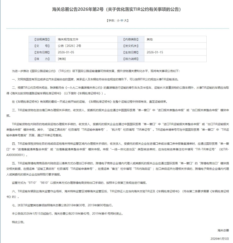 本公告不仅是TIR公约在中国落地的技术性细则,更是一份推动贸易便利化、支持跨境物流与新业态发展、深化“一带一路”互联互通的重要政策文件。它的实施预计将显著提升国际公路运输的效率与可靠性,为我国外贸高质量发展注入新动力。